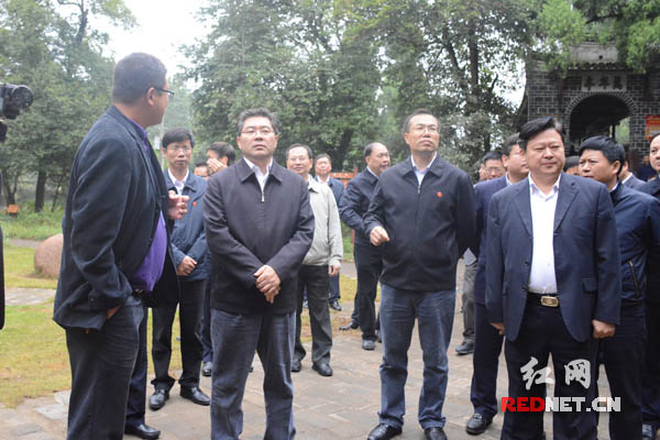 10月14日上午,隋忠诚(前排左二)同与会人员一道参观北湖区华塘镇三合村,了解当地乡村旅游发展情况。
